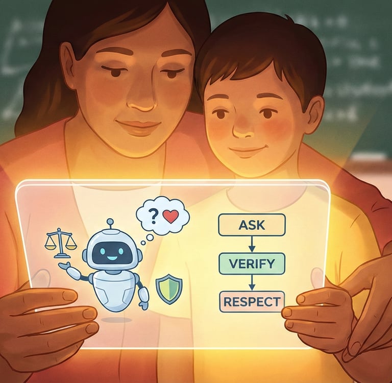The Goal: Demystify the technology. Shift the conversation from fear ("Will this help my kid cheat?") to function ("How can we use this as a family to plan a vacation or brainstorm dinner ideas?"). Frame AI not as a replacement for human thought, but as a tool that requires human guidance and ethical consideration.